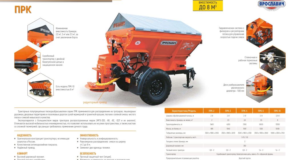 Пескоразбрасыватель тракторный ПРК «Ярославич» – коммунальная машина для зимнего обслуживания дорог и тротуаров, которая позволяет равномерно распределять противогололедные реагенты: сухую мраморную и гранитную крошку, песчано-соляную смесь или чистый песок по тротуарам, пешеходным дорожкам, дворовым территориям, поселковым дорогам. Технику эксплуатируют с тракторами распространённых марок МТЗ и их аналогами. Главными отличительными особенностями конструкций являются высокая мобильность и манёвренность, благодаря которым технику используют при ограниченном пространстве и на участках сложной геометрии, где раньше применялся только ручной труд.