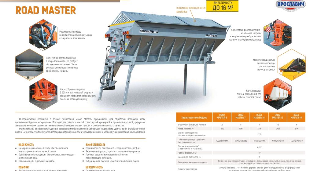 Road Master-16 — это уникальная конструкторская разработка европейского уровня, которая не имеет аналогов среди коммунально-дорожной техники подобного класса. Отличительными особенностями данного распределителя являются: высочайшая надежность всех узлов и механизмов, долгий срок службы и точная подача противогололедного материала, что достигнуто благодаря инновационным техническим решениям на уровне лучших мировых производителей.