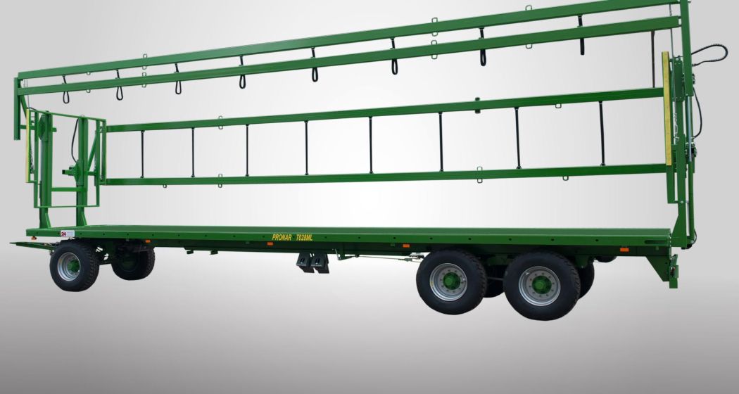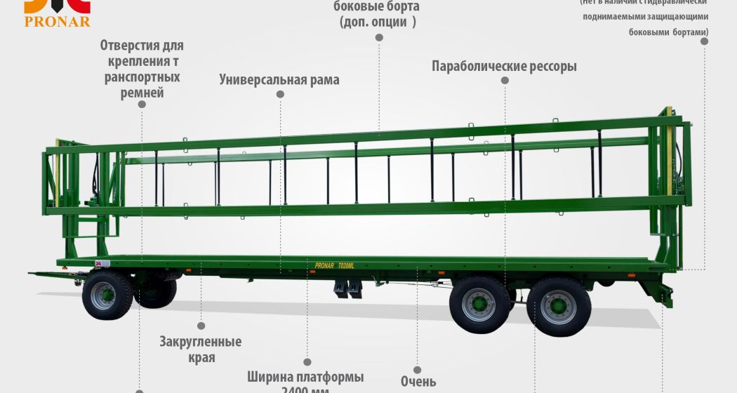 - Ширина платформы 2400 мм между стойкамиПрицеп PRONAR T028ML в основном предназначен для перевозки рулонов, тюков