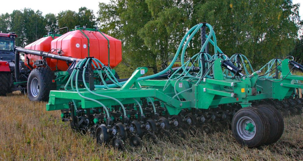 На бункере установлен дизельный двигатель (или более экономичный гидропривод), приводящий в действие пневмосистему. Семена воздушным потоком подаются на шесть распределительных узлов – один центральный и пять периферийных и далее — через систему семяпроводов, на каждый дисковый сошник.
